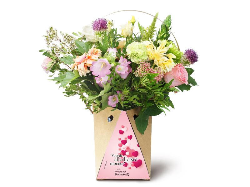 BloemenboxX met compact gebonden boeket in zachte tinten.